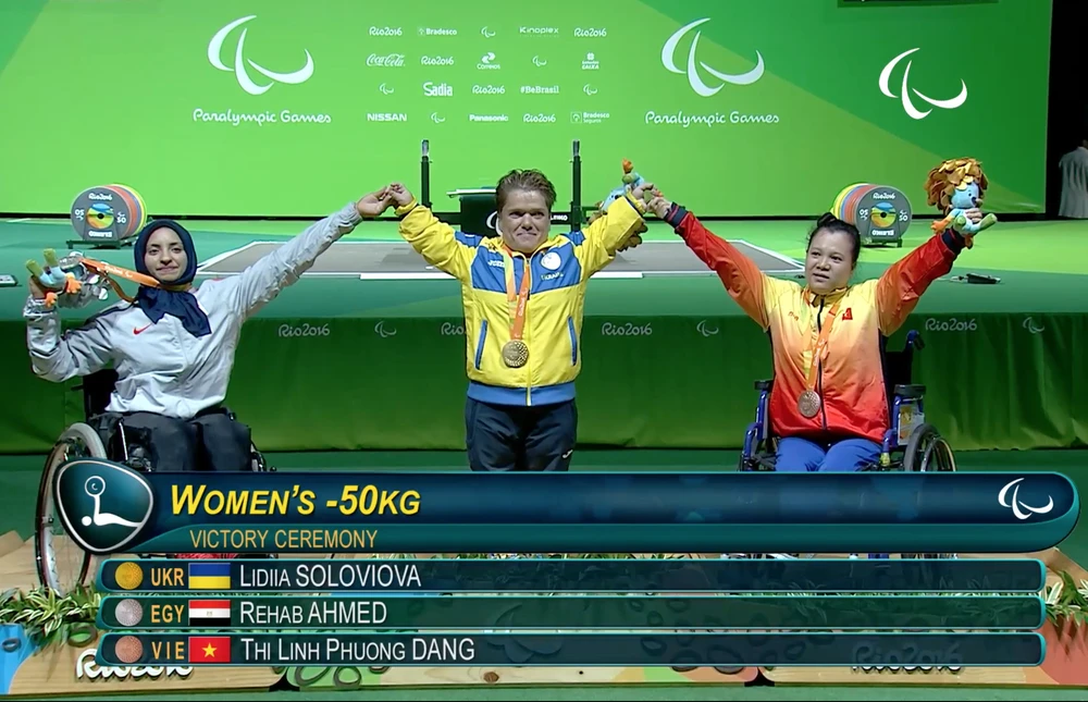 Nữ lực sĩ Việt Nam cùng hai đối thủ trên bục nhận huy chương