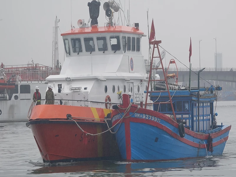 Tàu SAR 274 đã đưa toàn bộ bốn thuyền viên và tàu cá vào bờ an toàn. Ảnh: DaNang MRCC