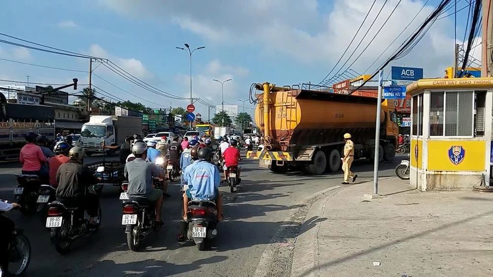 Khi gần đến giao lộ đường Nguyễn Hữu Trí (huyện Bình Chánh, TP.HCM) trong lúc đèn tín hiệu đang xanh nhưng phát hiện một xe bồn 60C-214.08 chạy cùng chiều trên làn ô tô, xin đèn rẽ phải vào đường Nguyễn Hữu Trí nên các xe đều dừng lại.