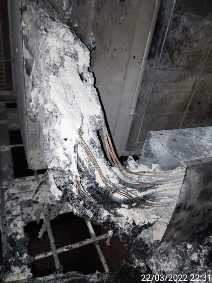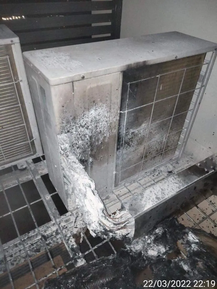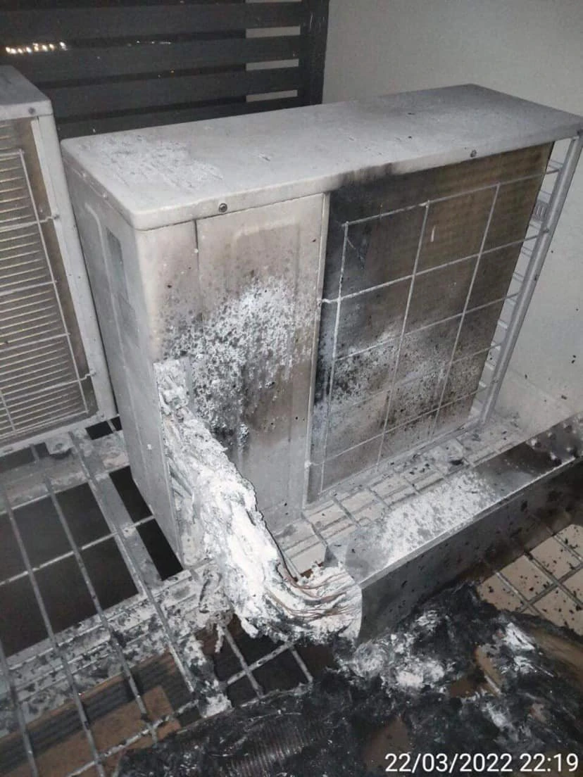 Cục nóng lạnh trong căn hộ bị cháy. Ảnh: NDCC