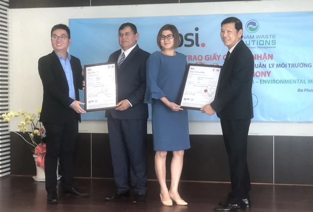 Ông Trần Anh Tuấn (bên trái), GĐ Tiếp thị của BSI trao hệ thống quản lý chất lượng ISO 9001 - 2015 và hệ thống quản lý môi trường ISO 14001-2015 cho đại diện VWS