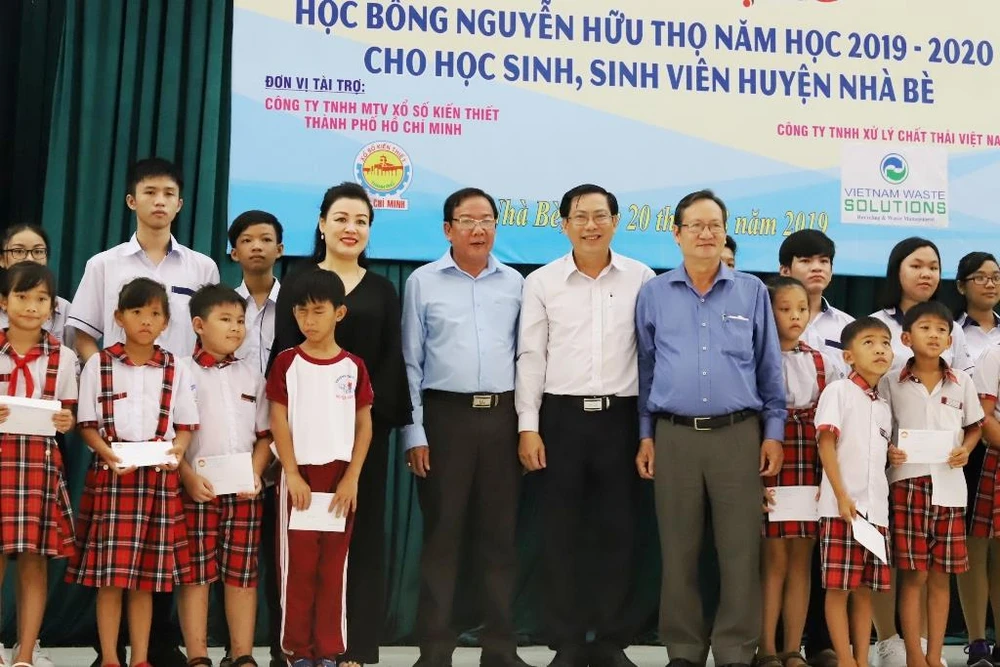 Tham dự lễ trao học bổng có lãnh đạo Ủy ban MTTQ Việt Nam TP.HCM và huyện Nhà Bè, các em HS-SV và nhà tài trợ là Công ty TNHH Xử lý chất thải Việt Nam (VWS).