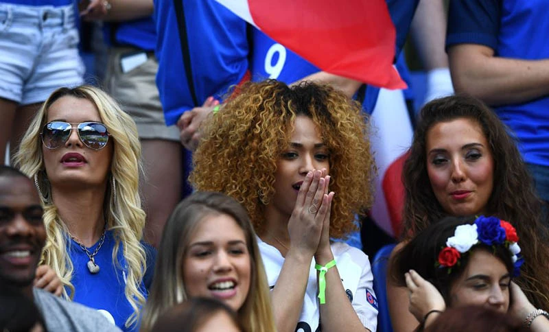 Những nàng WAGs xinh đẹp của các cầu thủ Pháp ngồi tập trung trên một góc khán đài.