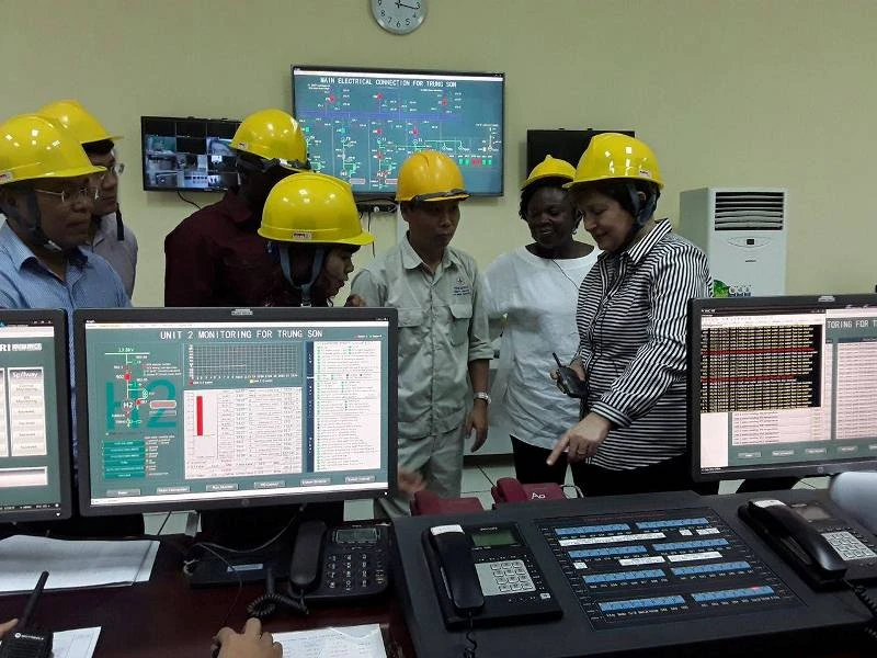 Ông Vũ Hữu Phúc, Chủ tịch kiêm Giám đốc Nhà máy thủy điện Trung Sơn (giữa), đang giới thiệu cho bà Kristalina Georgieva (phải), Tổng giám đốc WB, về dự án. Ảnh: TP