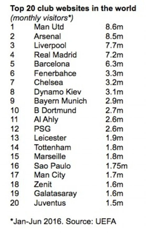 Theo thống kê, website của CLB Man United có đến 8,6 triệu lượt truy cập hàng tháng. Xếp thứ hai và ba lần lượt là Arsenal và Liverpool với 8,5 và 7,7 triệu lượt người truy cập hằng tháng.