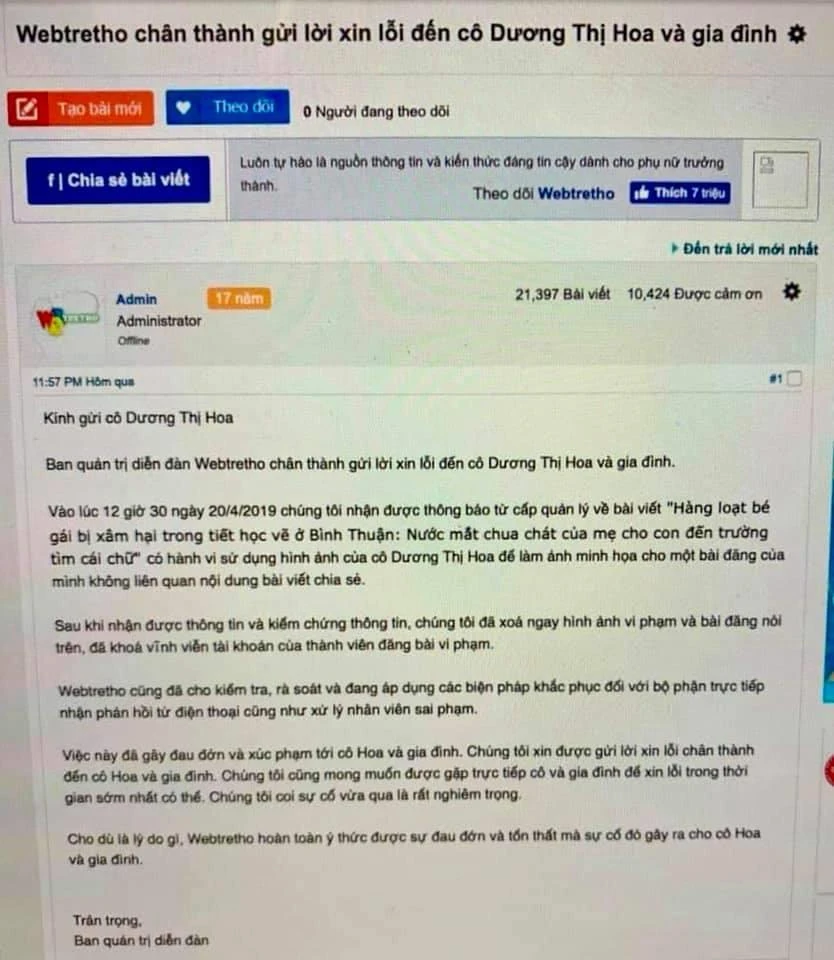 Ban quản trị diễn đàn Webtretho chân thành gửi lời xin lỗi đến cô Dương Thị Hoa và gia đình.