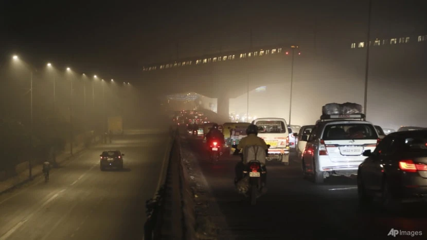 Người dân Ấn Độ lái xe trên con đường chìm trong khói bụi bẩn ở New Delhi, vào ngày 5-11-2020. Ảnh: AP