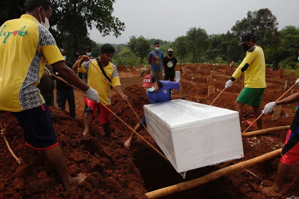 Nhân viên nghĩa trang chôn cất quan tài của một nạn nhân COVID-19 ở Indonesia. Ảnh: EPA-EFE
