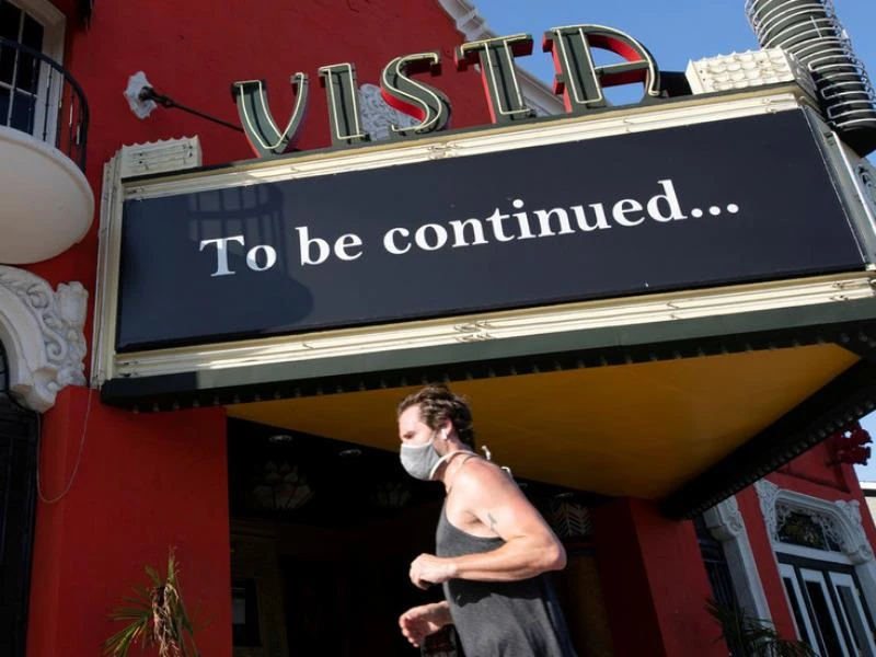 Một người đeo khẩu trang chạy bộ bên nhà hát Vista ở Los Angeles, bang California, Mỹ vào ngày 29-6. Ảnh: REUTERS/RT