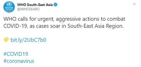Trên Twitter của mình, WHO tại Đông Nam Á cũng kêu gọi các quốc gia hành động quyết liệt, xông xáo trong cuộc chiến chống COVID-19. Ảnh: TWITTER