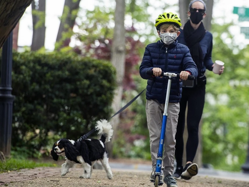 Một cậu bé và mẹ dắt thú cưng đi dạo ở công viên Montrose ở thủ đô Washington D.C. hôm 11-5. Ảnh: REUTERS