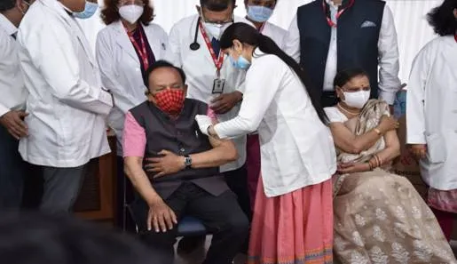 Bộ trưởng Y tế Ấn Độ Harsh Vardhan (trái) và vợ được tiêm vaccine Covaxin do công ty Bharat Biotech sản xuất. Ảnh: PIB.GOV.IN