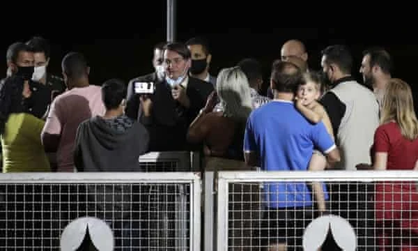 Tổng thống Brazil Jair Bolsonaro kéo khẩu trang xuống để chụp ảnh với người ủng hộ. Ảnh: THE GUARDIAN