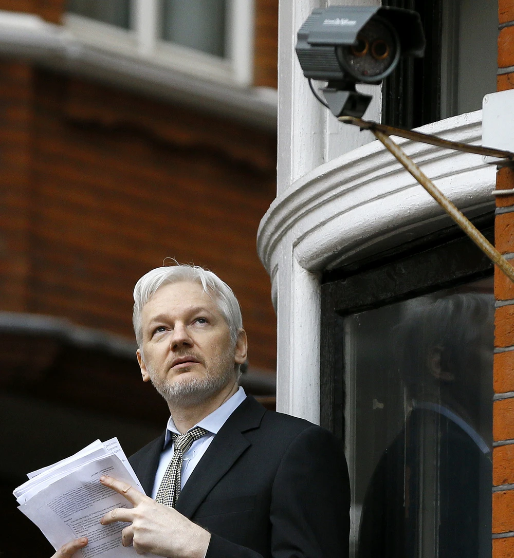 Nhà sáng lập Wikileaks Assange tại cuộc họp báo ở đại sứ quán Ecuador ở London (Anh). (Ảnh: AP)