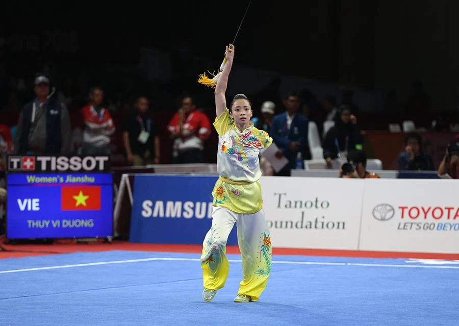 Với kỳ tích giành huy chương vàng Asean Games 2014 tại Hàn Quốc, Dương Thúy Vi được giới truyền thông lẫn cổ động viên trong nước rất kỳ vọng. Sáng nay cô chỉ xếp thứ ba ở bài thi đầu tiên nội dung kiếm thuật với 9.7 điểm. Trong khi đó, vận động viên của Trung Quốc Mengjiao có thành tích tốt nhất với 9.75 điểm.