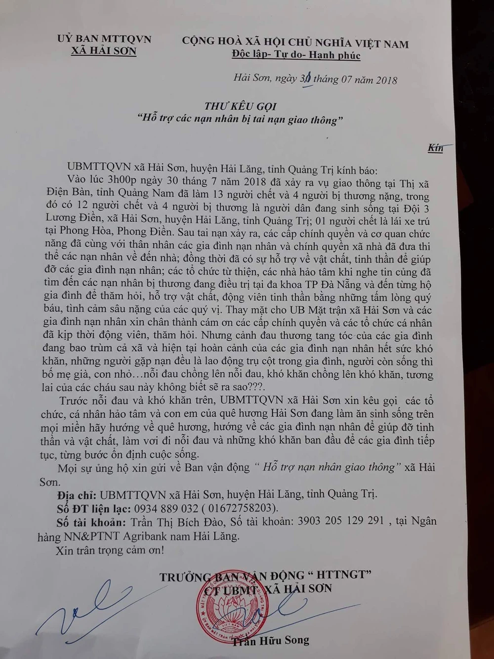 Chiều 1-8, ông Trần Hữu Song (Chủ tịch Ủy ban MTTQ Việt Nam xã Hải Sơn, huyện Hải Lăng, tỉnh Quảng Trị) cho biết đã gửi thư kêu gọi xã hội chung tay, góp sức hỗ trợ gia đình các nạn nhân trong vụ tai nạn giao thông thảm khốc khiến 13 người tử vong, bốn người bị thương rạng sáng 30-7 tại Quảng Nam.