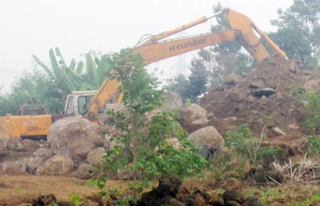 Một chiếc xe múc đang đào bới lấy đá trong vườn bà C. và những tảng đá đang tập kết, chờ đưa đi tiêu thụ. Ảnh: TD
