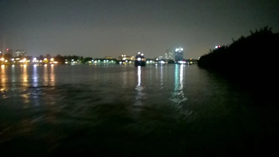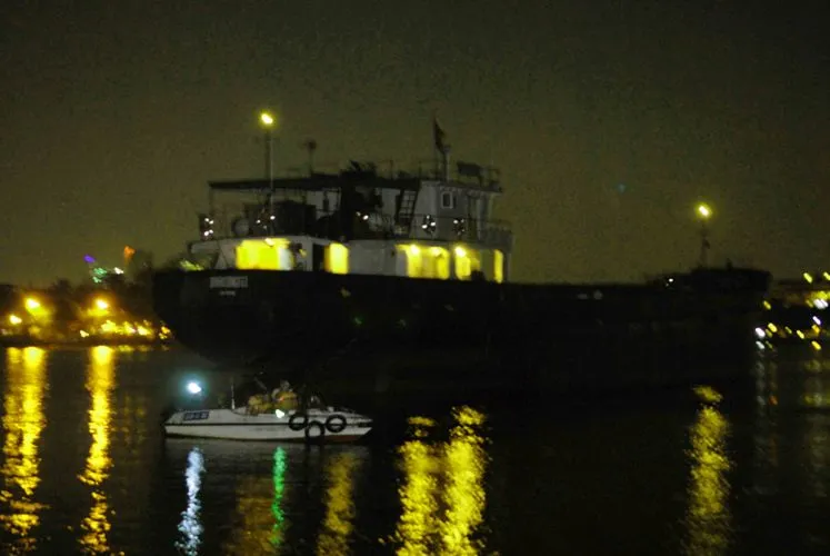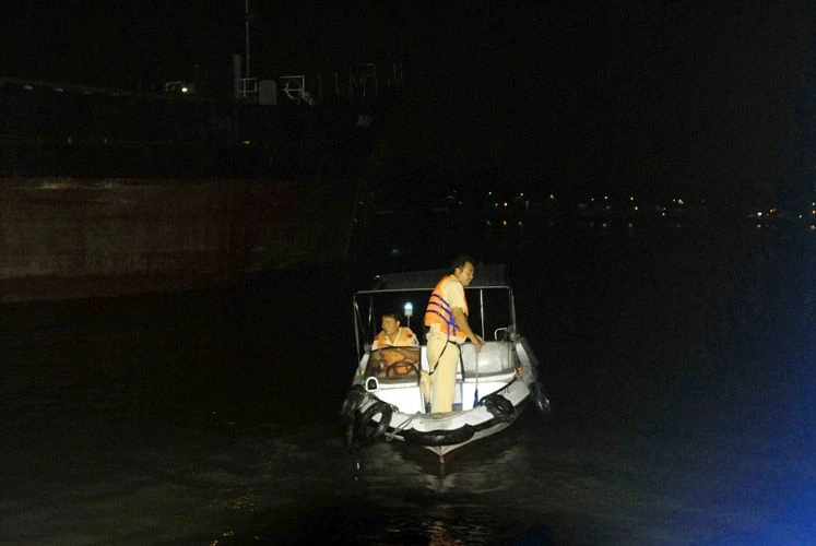 Ca nô của cảnh sát đường sông đang rà soát trên khu vực xà lan bị nạn. Ảnh: Xuân Ngọc