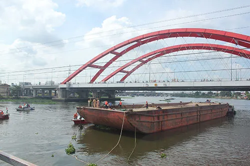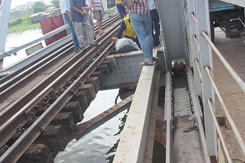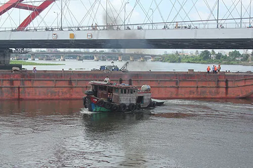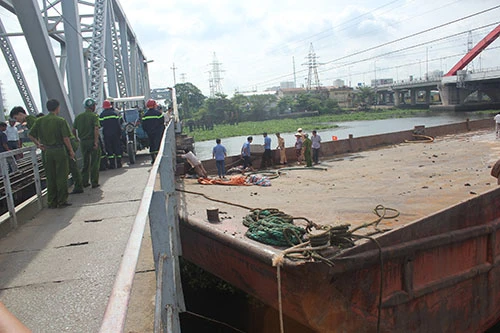 Clip xà lan kẹt cứng dưới gầm cầu sắt Bình Lợi.