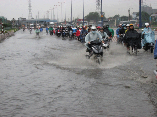 Tại đây, vùng nước ngập rộng, sâu hơn nửa bánh xe máy khiến các phương tiện ùn tắc vì cố né vùng nước ngập. Hàng trăm lượt xe chen nhau vượt qua vùng nước ngập sâu khiến nhiều người bực mình vì bị nước bắn tung tóe ướt người. Nhiều xe qua đây đã bị chết máy.