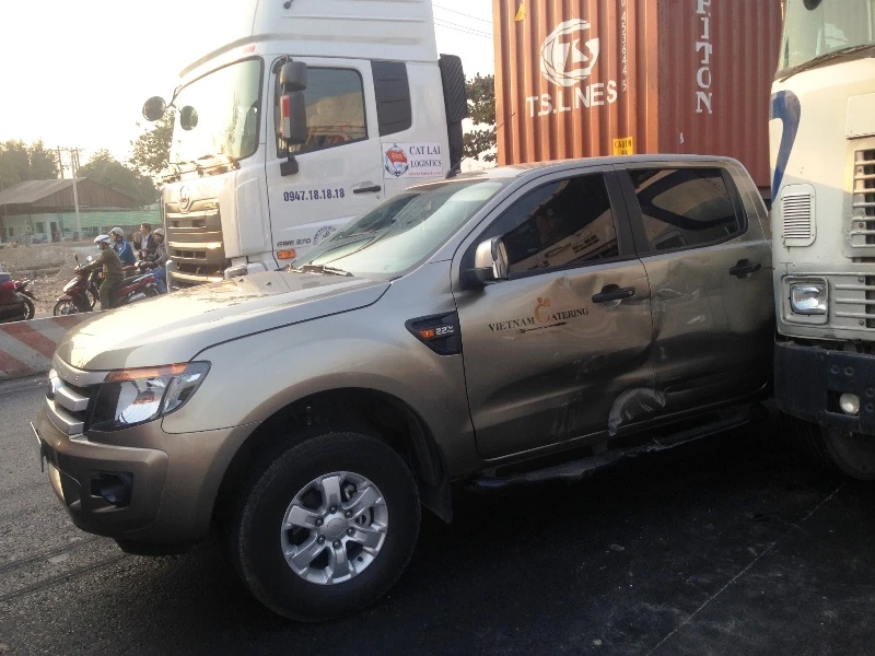 Khi đến gần ngã tư MK (phường phước long A, quận 9, TP.HCM), tài xế đánh tay lái tránh một xe container khác đang dừng đỗ phía trước do chết máy thì va phải hông xe ô tô bán tải biển số 51C-578.65 đang lưu thông song song cùng chiều.