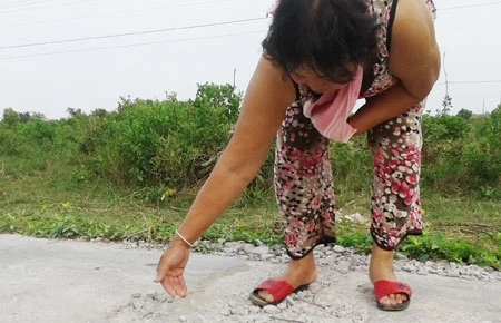 Bà Trần Ngọc Diễm đang dùng tay cào con lộ mới làm xong 15 ngày đã bong tróc, lòi cả sắt. Ảnh: TV