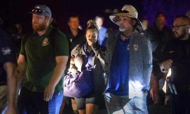 Các sĩ quan cảnh sát hộ tống người dân từ Công viên Christmas Hill ra ngoài sau vụ nổ súng ở lễ hội tỏi Gilroy ở thành phố San Jose, bang California, Mỹ. Ảnh: AP