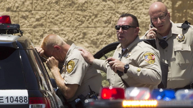Một cảnh sát Las Vegas khóc thương 2 đồng đội bị bắn chết - Ảnh: Reuters
