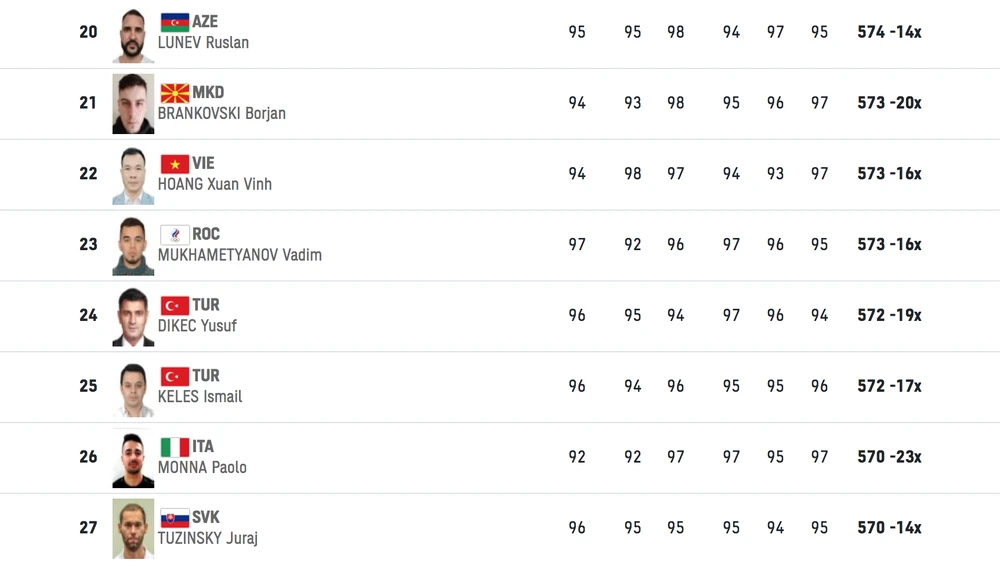 Tương tự thất bại của tay súng Việt Nam, á quân 2016 Felipe Almeida cũng chỉ đạt 566 điểm, xếp hạng 32/36 ở vòng loại. Trong khi đó tay súng từng bốn lần giành HCV Olympic Jin Jong Oh cũng chỉ xếp hạng 16/36 với tổng điểm 576.