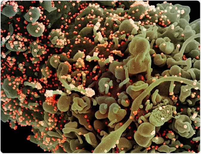 Ảnh quét màu của một tế bào bị nhiễm các hạt virus SARS-COV-2 trình chiếu trên máy tính. Ảnh: EPA