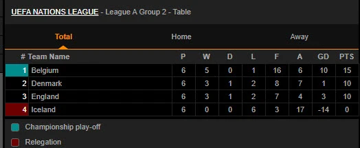 Kết thúc vòng bảng 2 Nations League A, Bỉ dẫn đầu bảng với 15 điểm, Đan Mạch và Anh cùng có 10 điểm còn Iceland không có điểm nào.