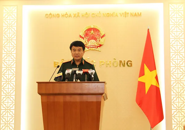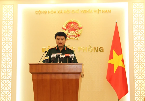 Thượng tướng Võ Văn Tuấn - Phó Tổng tham mưu trưởng Quân đội nhân dân Việt Nam thông báo kết quả tìm kiếm hai máy bay Su-30MK và Casa 212 từ ngày 14-6 đến nay. Ảnh: Bộ Quốc phòng