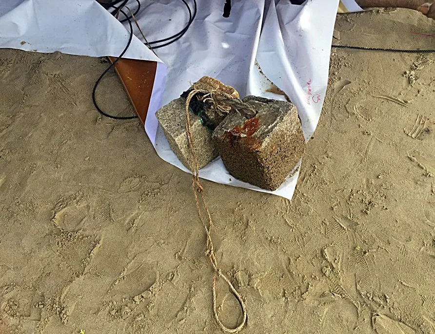 Khi vớt thi thể lên đưa vào bờ, người dân phát hiện hai chân người này bị cột chặt vào hai tảng đá to nên nghi ngờ là án mạng. Thi thể người đàn ông khá mập mạp, cao lớn, trên người mặc quần đùi hoa màu đỏ, không mặc áo.