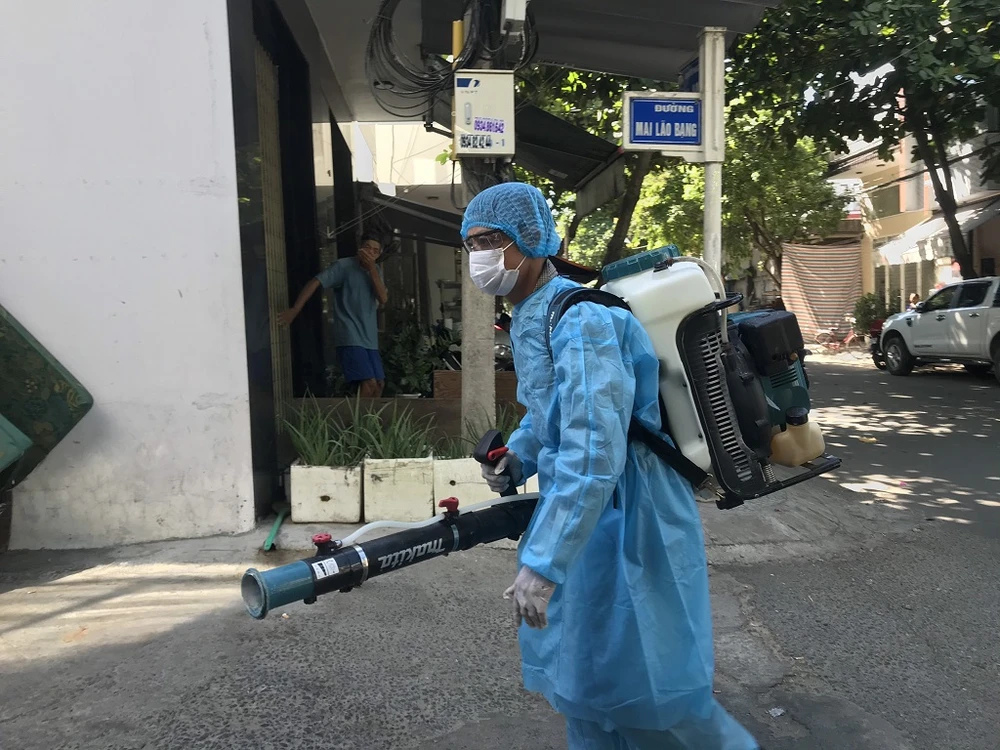 Lực lượng chức năng phun khử khuẩn tại khu vực nhà Bệnh nhân 418 sáng nay. Ảnh: HÀ HẢI
