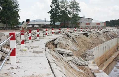 Chỉ một cơn mưa làm sạt lở bờ kênh của dự án mới khánh thành cách đây một tháng, là một thách thức đối với chất lượng công trình. Ảnh: VŨ HỘI