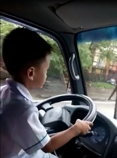 Bé trai 6 tuổi lái xe tải gây xôn xao trên mạng xã hội. Ảnh cắt từ Clip.