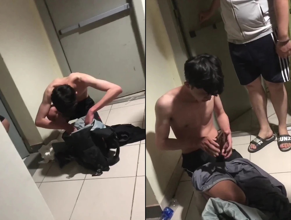 Nam sinh được tìm thấy trong trạng thái không mặc áo, tay bị trói. Ảnh cắt từ clip