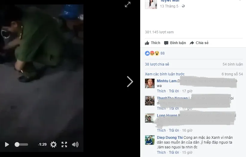 Thông tin ban đầu, rạng sáng 13-5, Facebook mang tên là Tuyết Mai chia sẻ trên trang cá nhân của mình clip cùng câu chuyện với tựa đề: “Lại chuyện công an cho người đánh dân”.