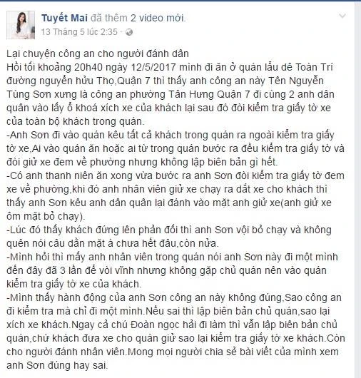 Cô gái chia sẻ vụ việc xảy ra vào 20 giờ 40 ngày 12-5. Khi cô gái cùng bạn đi ăn ở quán lẩu dê trên đường Nguyễn Hữu Thọ, quận 7 thì thấy anh công an mặc quân phục biển tên Nguyễn Tùng Sơn xưng là Công an phường Tân Hưng, quận 7 đi cùng hai anh dân quân vào lấy ổ khóa xích xe của khách lại sau đó đòi kiểm tra giấy tờ xe của toàn bộ khách trong quán.