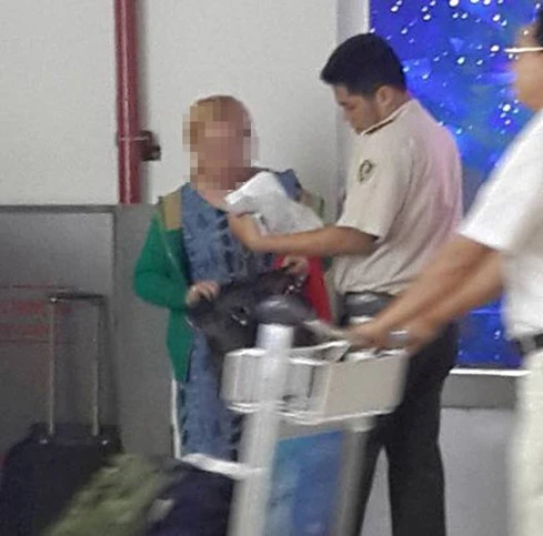 An ninh sân bay làm việc với mẹ của cháu bé. (Ảnh do nhân chứng cung cấp)
