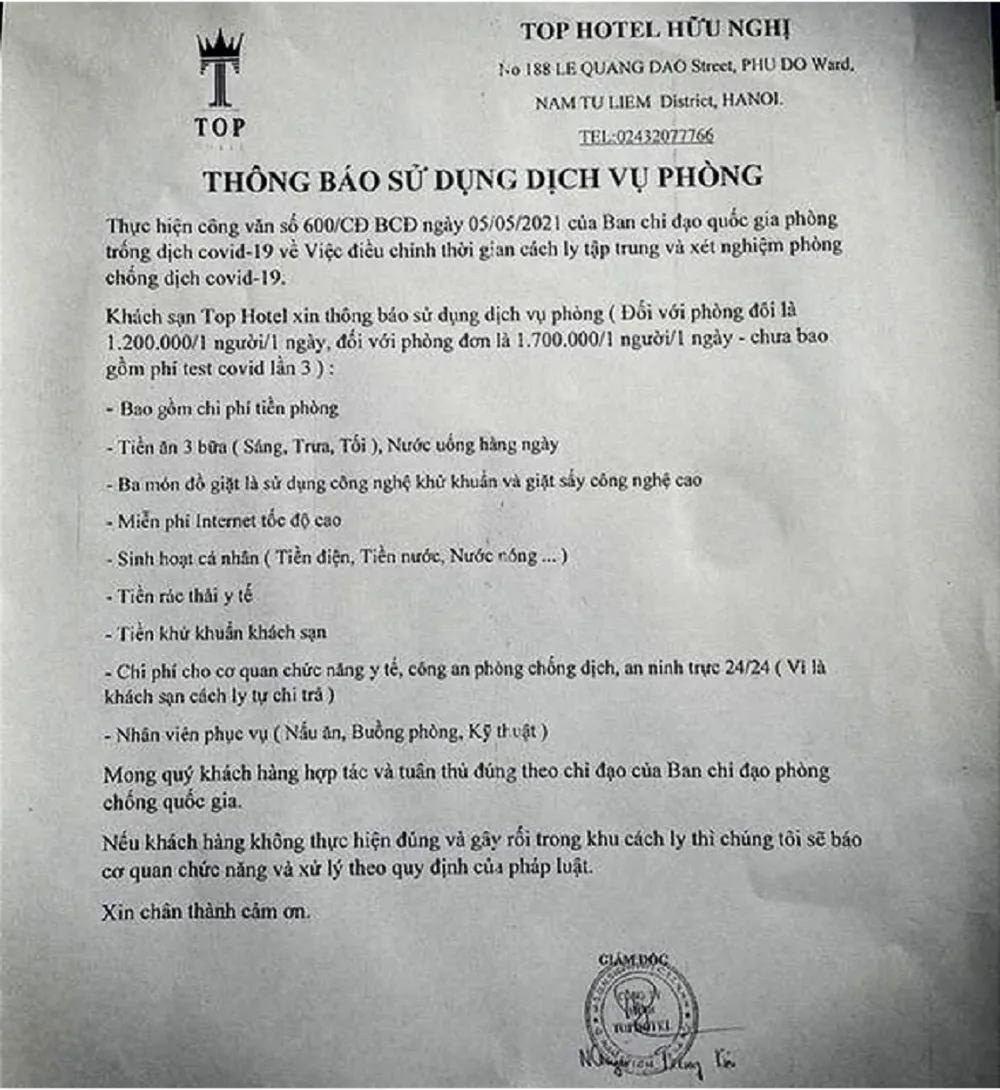 Vừa qua, một số người từ Nhật Bản về Việt Nam thực hiện cách ly tại khách sạn Top Hotel Hữu Nghị (Nam Từ Liêm, Hà Nội), phản ánh khách sạn này thu phí cách ly quá đắt.