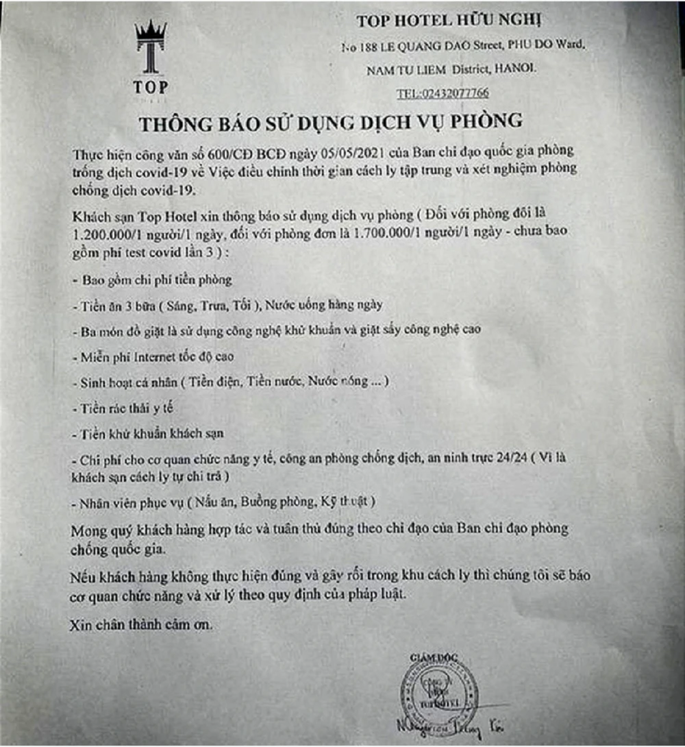 Bảng này liệt kê hàng loạt dịch vụ như tiền phòng, tiền ăn, tiền giặt đồ, khử khuẩn khách sạn... Tuy nhiên đều không niêm yết giá.