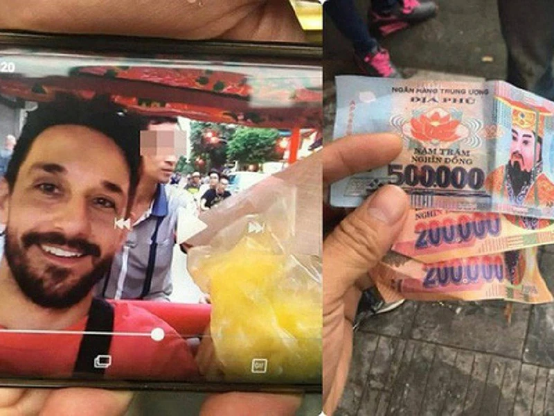 Trước đó, một nickname tên Huu Phuc đã đăng lên Facebook clip cùng một số bức ảnh chụp lại ba tờ tiền vàng mã cùng hình ảnh hai vị khách một nam, một nữ đến từ Pháp. Theo hai du khách, khi tới Hà Nội, họ được một người chạy xích lô mời chào dạo phố cổ với giá 600.000 đồng/giờ.
