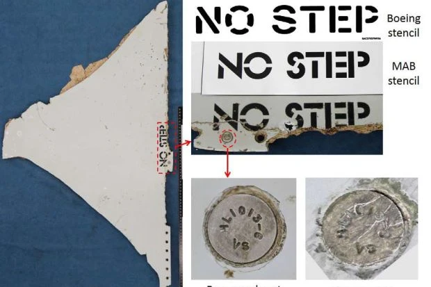 Phông chữ trên hàng chữ “No Step” trên một mảnh vỡ trùng khớp với phông chữ hãng hàng không Malaysia Airlines sử dụng. Một cái chốt khóa trên mảnh vỡ cũng khớp với chốt khóa trong dây chuyền lắp ráp máy bay của Boeing.