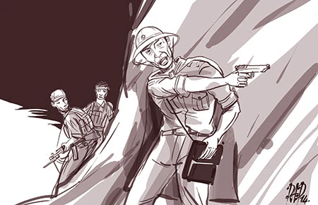 Chính trị viên liền rút khẩu K54 ở bên hông ra, nói nhanh: “Trên đỉnh đồi có thang dây đưa xuống. Anh đưa anh em theo lối đó về pháo đài, để tôi chặn bọn Khợ lại”.