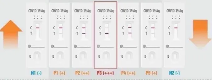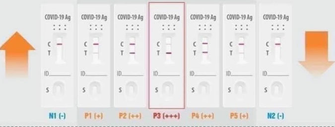 Tải lượng virus SARS-CoV-2 tăng dần được thể hiện qua vạch T của xét nghiệm nhanh kháng nguyên. Ảnh: HCDC