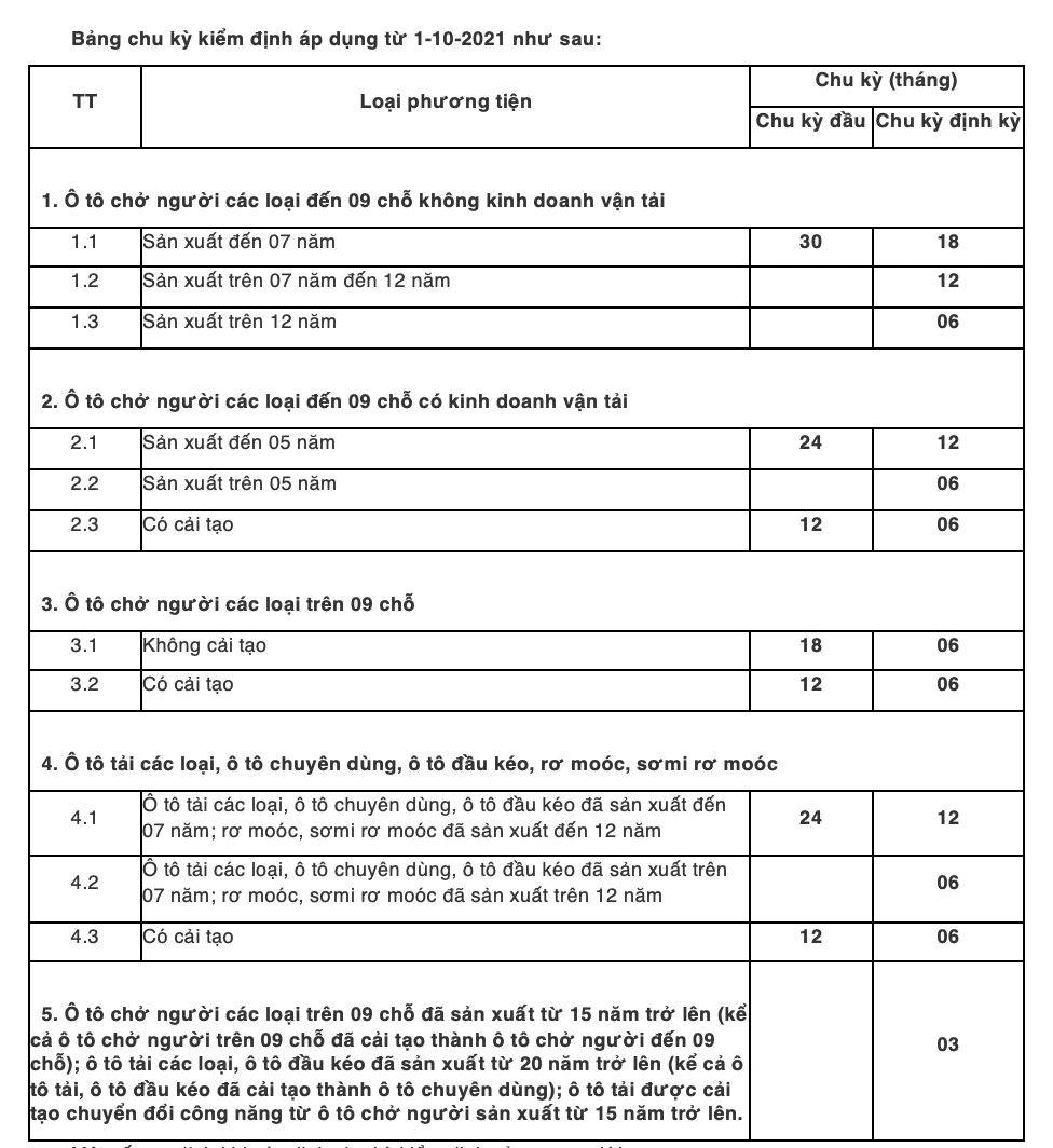 - Chu kỳ đầu chỉ áp dụng đối với xe cơ giới chưa qua sử dụng kiểm định lần đầu trong thời gian 2 năm, tính từ năm sản xuất.