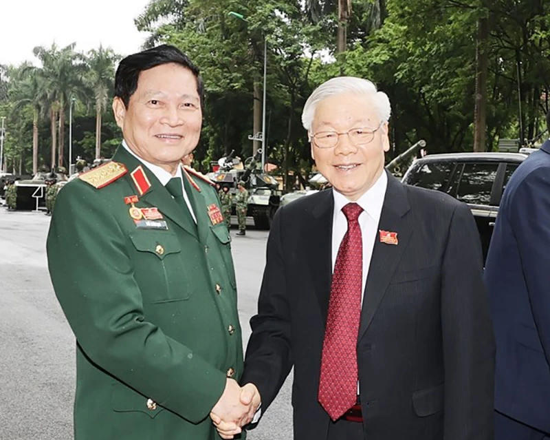 Đại tướng Ngô Xuân Lịch đón Tổng Bí thư, Chủ tịch nước Nguyễn Phú Trọng đến dự Đại hội. Ảnh TTXVN