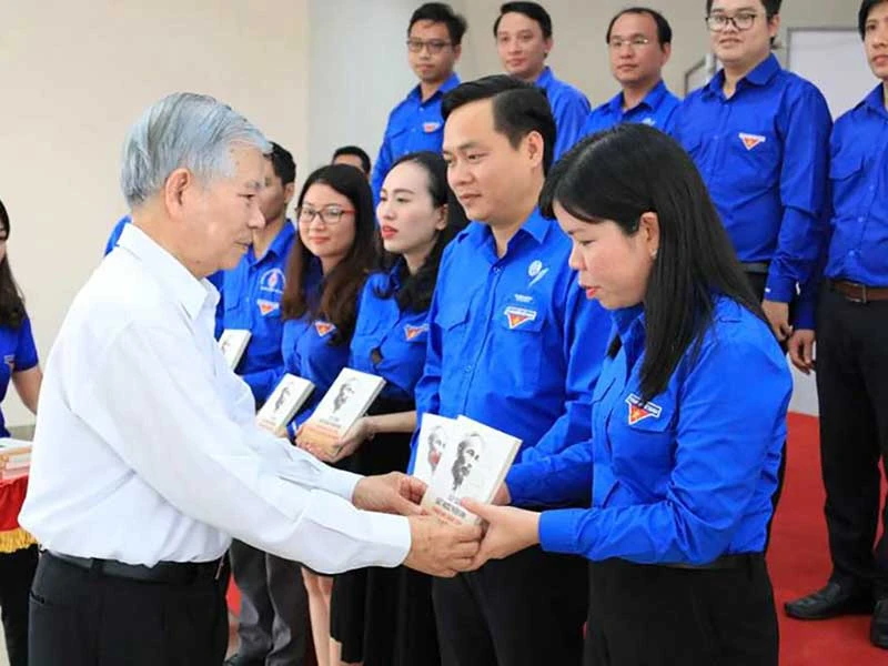 Nguyên Chủ tịch nước trao tặng sách cho thế hệ trẻ tỉnh Bình Dương. Ảnh: MINH HẰNG