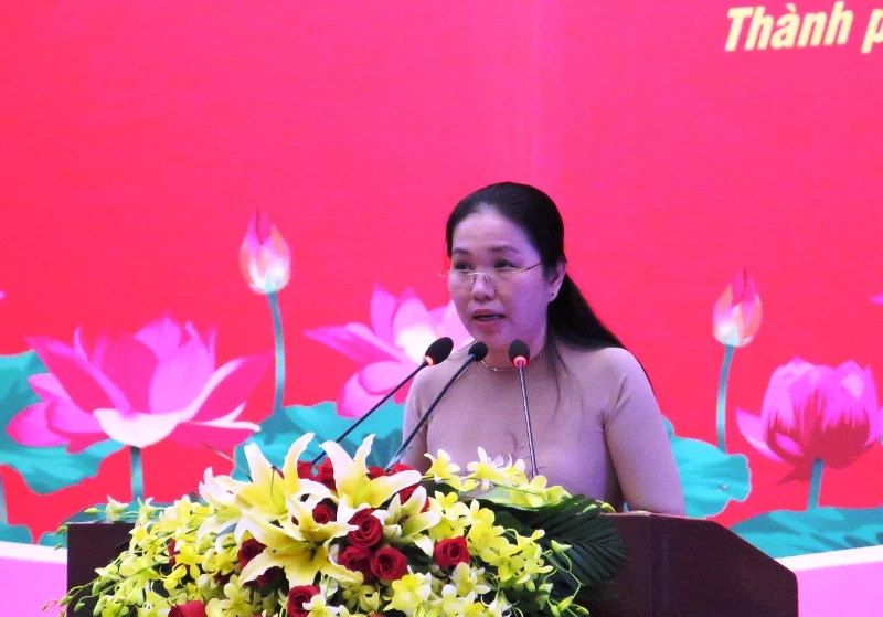 Bà Lê Thị Hồng Nga - Phó Bí thư Đảng ủy Khối Dân - Chính - Đảng TP.HCM, phát biểu tại buổi lễ. Ảnh: TÁ LÂM
